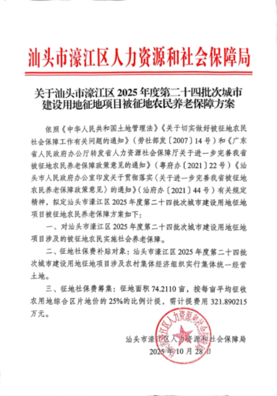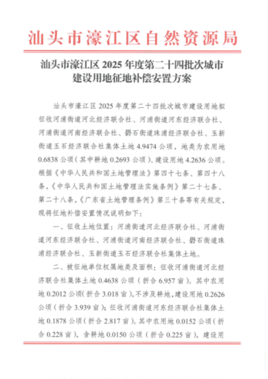 根據《中華人民共和國土地管理法》第四十七條、第四十八條,《中華人民共和國土地管理法實施條例》第二十七條、第二十八條,《廣東省土地管理條例》第三十條的規定,我區政府組織編制了汕頭市濠江區2025年度第二十四批次城市建設用地征地補償安置方案,現將征收土地補償安置有關事項公告如下: