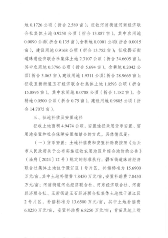 根據《汕頭市人民政府關于公布實施征收農用地區片綜合地價的公告》(汕府〔2024〕12號)的規定,礐石街道珠浦經濟聯合社集體土地位于濠江區1號片區,土地補償費標準為7.8450萬元/畝,安置補助費標準為7.8450萬元/畝;河浦街道河北經濟聯合社、河東經濟聯合社、河南經濟聯合社、玉新街道玉石經濟聯合社集體土地位于濠江區2號片區,土地補償費標準為6.8250萬元/畝,安置補助費標準為6.8250萬元/畝。