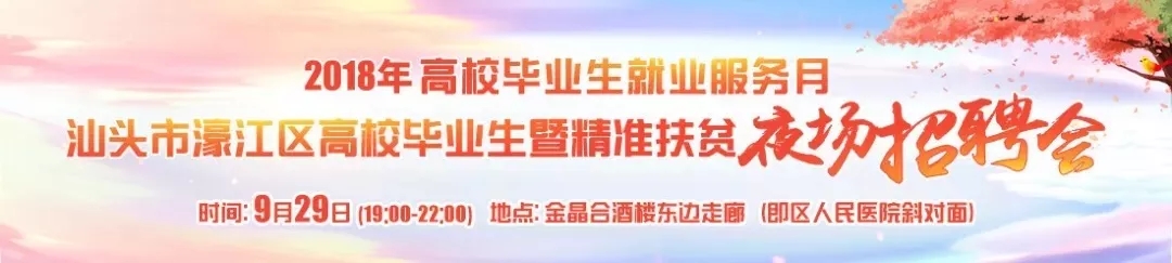 ????為貫徹落實《關(guān)于印發(fā)廣東省2018年高校畢業(yè)生就業(yè)服務(wù)月活動組織實施方案的通知》(粵人社明電﹝2018﹞65號)、《關(guān)于開展廣東省2018年高校畢業(yè)生就業(yè)服務(wù)月集中宣傳服務(wù)日活動的通知》(粵人社函﹝2018﹞2716號)和市人社局的有關(guān)通知精神及要求,深入實施高校畢業(yè)生就業(yè)創(chuàng)業(yè)促進計劃,集中幫助離校未就業(yè)高校畢業(yè)生就業(yè)創(chuàng)業(yè),結(jié)合精準扶貧工作,區(qū)人社局將在2018年高校畢業(yè)生就業(yè)服務(wù)月期間舉辦濠江區(qū)高校畢業(yè)生暨精準扶貧夜場招聘會。屆時將有比亞迪、上海電氣等近70家企業(yè)進場招聘,歡迎求職者屆時進場交流。