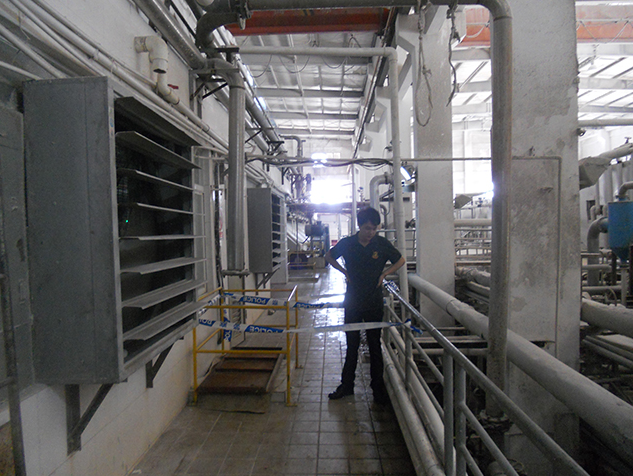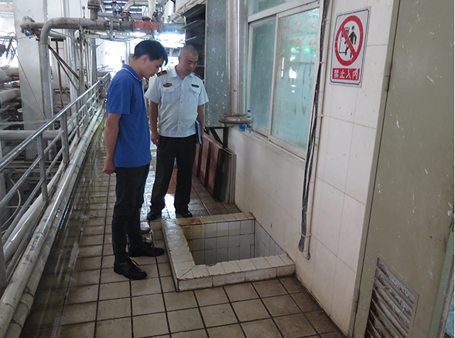 1、萬安公司現有制漿池27個,漿池設施設備運作正常,事故地點為萬安公司生產一部制漿車間11號漿池,該漿池為鋼混結構建筑(外壁貼白色瓷磚),大致呈長方體結構,內壁長約6m,寬約4m,高約3.2m。該漿池在制漿車間二樓操作平臺留有長方形池口(長為0.75m、寬為0.7m),池口高出周圍地面小于10cm,日常用不銹鋼防護蓋(柵格間隔小于10cm)蓋住,未上鎖。現場勘查時,該漿池池口防護蓋(不銹鋼材料)已不見,沒有任何防護措施(見圖1)。