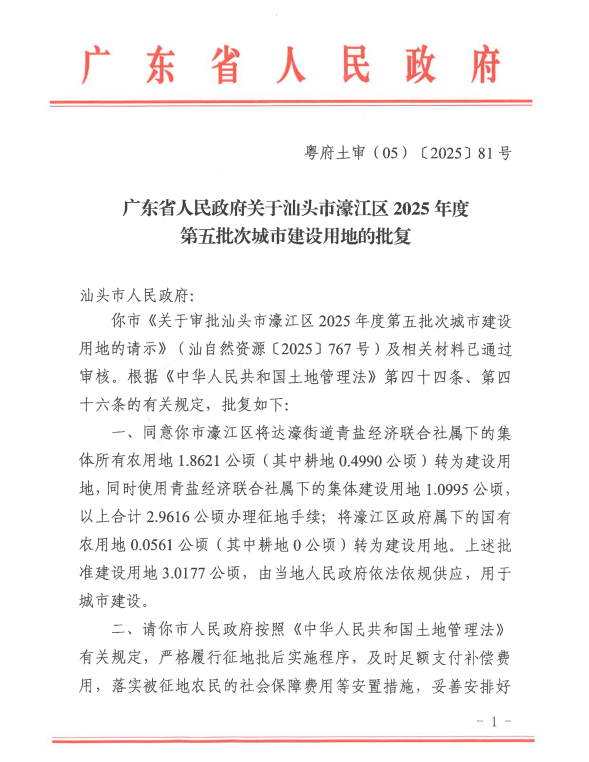 《廣東省人民政府關于汕頭市濠江區2025年度第五批次城市建設用地的批復》(粵府土審(05)〔2025〕81號)已經廣東省人民政府批準。現將有關事項公告如下: