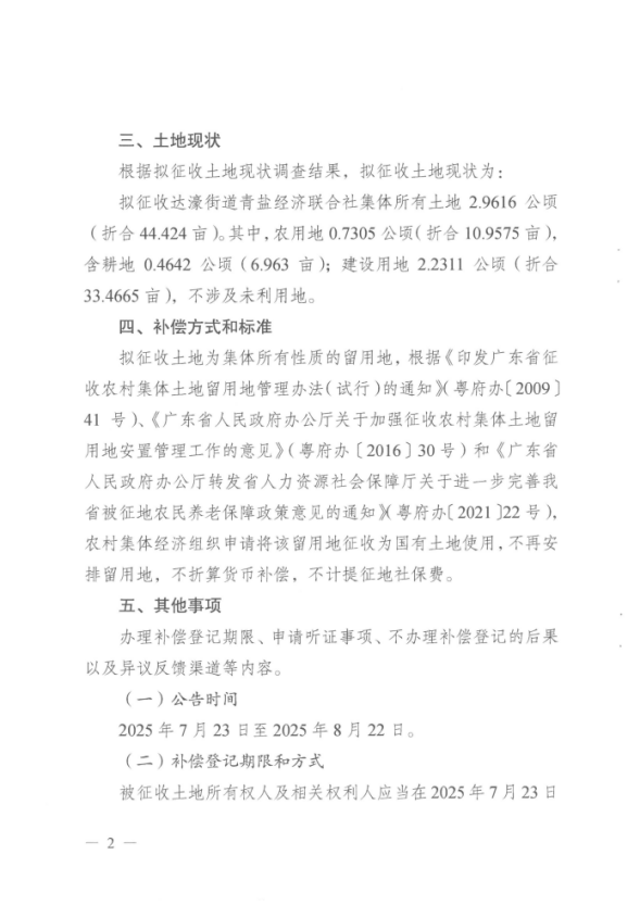 本次征收土地根據《中華人民共和國土地管理法》、《廣東省實施〈中華人民共和國土地管理法〉辦法》、《廣東省人民政府辦公廳關于加強征收農村集體土地留用地安置管理工作的意見》(粵府辦〔2016〕30號)、《印發廣東省征收農村集體土地留用地管理辦法(試行)的通知》(粵府辦〔2009〕41號)和《廣東省人民政府辦公廳轉發省人力資源社會保障廳關于進一步完善我省被征地農民養老保障政策意見的通知》(粵府辦〔2021〕22號)的有關規定,集體申請集體土地轉國有土地不計提土地補償及勞力安置、留用地安置;青苗及地上附著物補償和其他補償費由集體自行理楚,不計提征地社保費用。