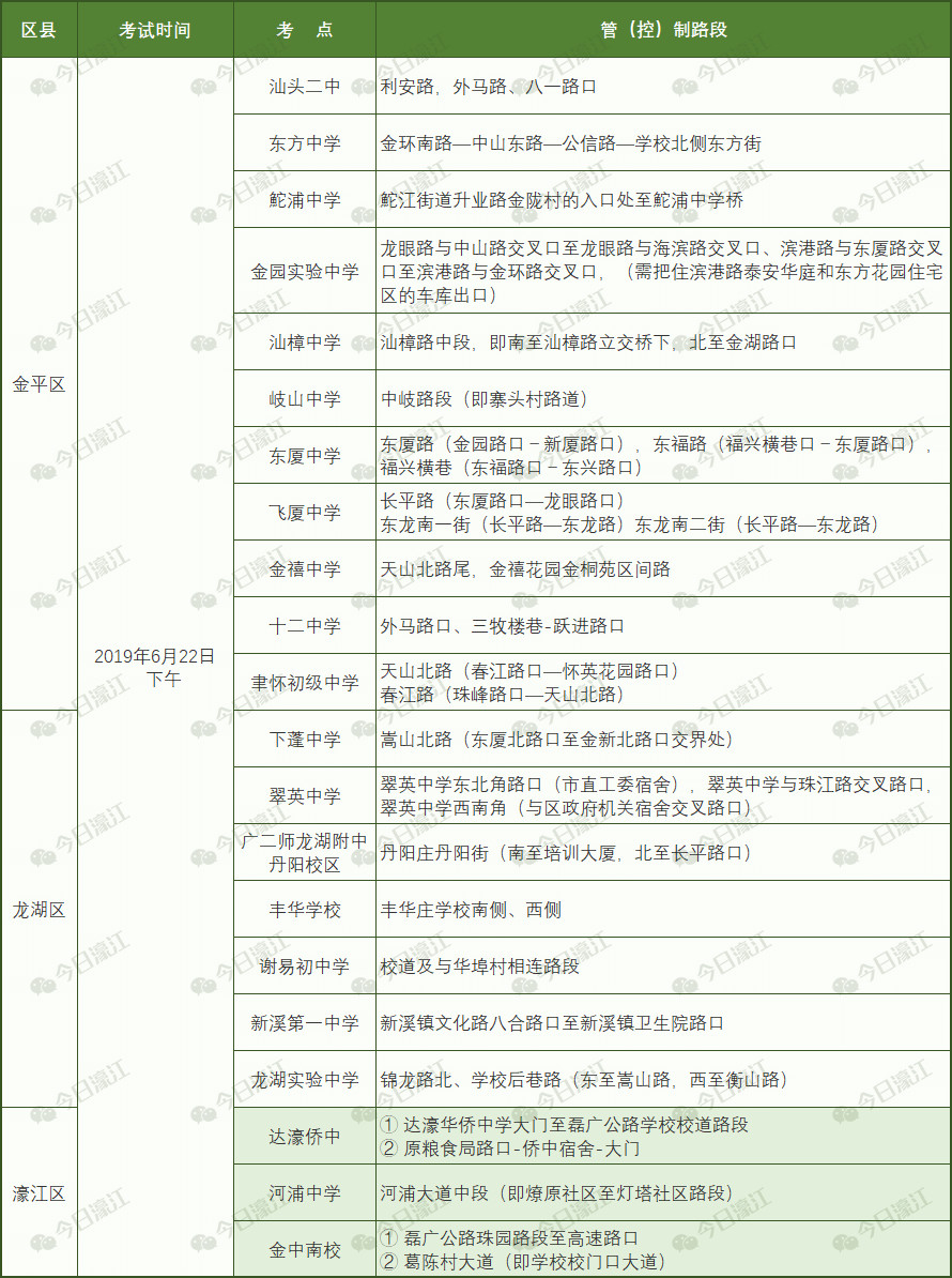 今年,我區設有達濠華僑中學、河浦中學、金中南校共3個考點。屆時,濠江交警部門將對以下路段實行臨時管(控)制,請各位車主提前規劃好路線。