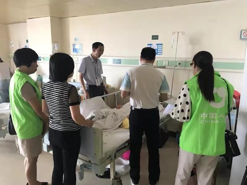 △市衛(wèi)生健康局相關(guān)工作人員、保險公司工作人員向發(fā)生意外傷害住院老人講解“銀齡安康行動”保障內(nèi)容