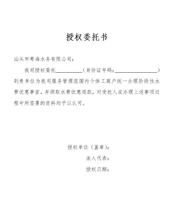 5. 二次供水服務(wù)單位需提供優(yōu)惠期內(nèi)向個(gè)體工商戶收取水費(fèi)的憑證原件及復(fù)印件及與水表戶名一致的管理單位出具的《授權(quán)委托書》。