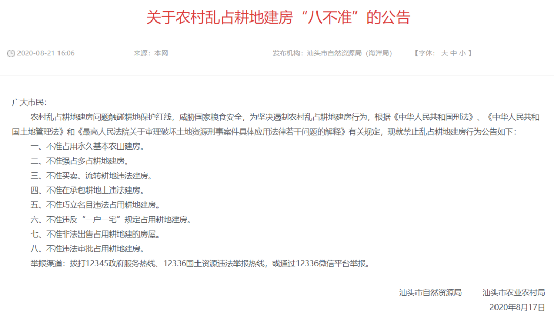 農村亂占耕地建房問題觸碰耕地保護紅線,威脅國家糧食安全,為堅決遏制農村亂占耕地建房行為,根據《中華人民共和國刑法》、《中華人民共和國土地管理法》和《最高人民法院關于審理破壞土地資源刑事案件具體應用法律若干問題的解釋》有關規定,市自然資源局、市農業農村局就禁止亂占耕地建房行為發布《關于農村亂占耕地建房“八不準”的公告》。