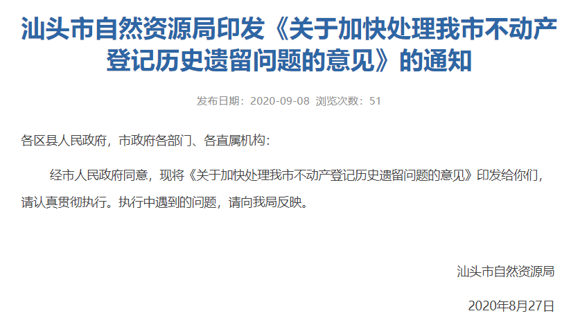為加快處理我市不動產登記中存在的歷史遺留問題,切實規范不動產登記行為,以“依法依規、尊重歷史、面對現實、為民利民”為原則,以維護人民群眾利益為核心,保護權利人合法權益,根據相關法律法規,結合我市實際,近日,汕頭市自然資源局發布《關于加快處理我市不動產登記歷史遺留問題的意見》(點擊查閱《意見》全文)。