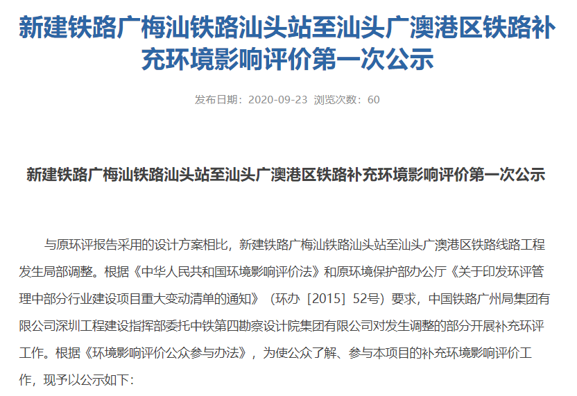 記者了解到,與原環評報告采用的設計方案相比,新建鐵路廣梅汕鐵路汕頭站至汕頭廣澳港區鐵路線路工程發生局部調整。根據《中華人民共和國環境影響評價法》和原環境保護部辦公廳《關于印發環評管理中部分行業建設項目重大變動清單的通知》(環辦〔2015〕52號)要求,中國鐵路廣州局集團有限公司深圳工程建設指揮部委托中鐵第四勘察設計院集團有限公司對發生調整的部分開展補充環評工作。根據《環境影響評價公眾參與辦法》,為使公眾了解、參與本項目的補充環境影響評價工作,目前正在進行公示。