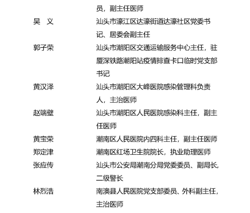 濠江區人民醫院副院長、黨總支委員、副主任醫師周少輝,達濠街道達濠社區黨委書記、居委會副主任吳義入選廣東省抗擊新冠肺炎疫情先進個人擬表彰對象名單;