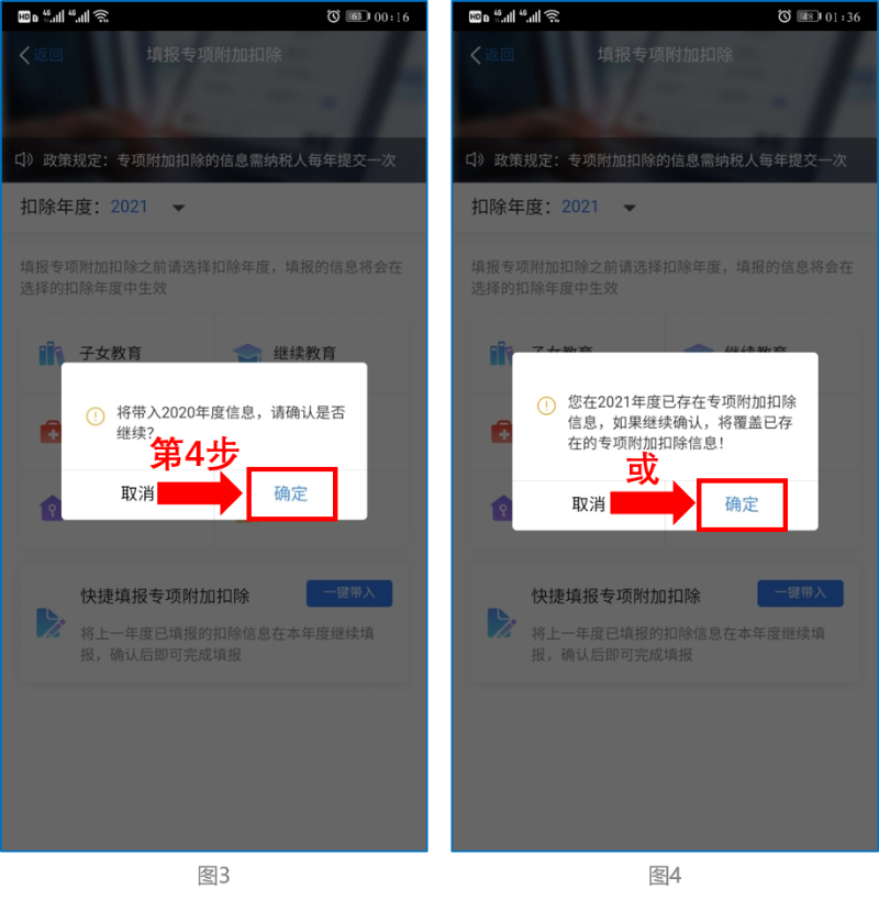 ② 依據提示“將帶入2020年度信息,請確認是否繼續?”或者“你在2021年度已存在專項附加扣除信息,如果繼續確認,將覆蓋已存在的專項附加扣除信息!”,確認后點擊“確定”;如下圖3、圖4: