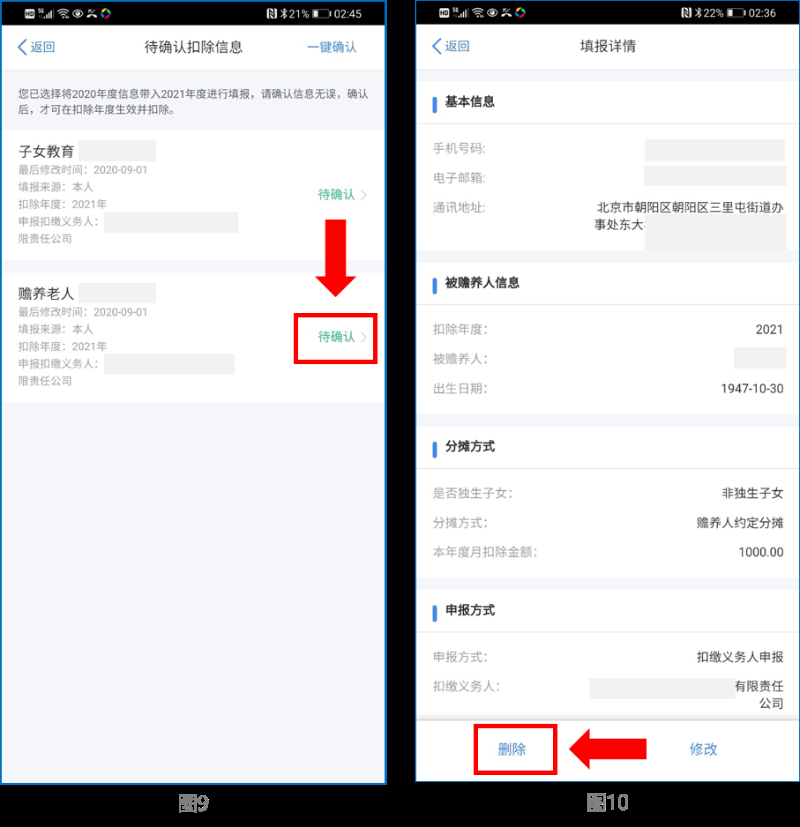 點擊“待確認”狀態的贍養老人信息,點擊“刪除”,再點擊“一鍵確認”。如下圖9、圖10: