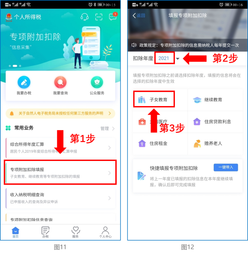 先按情形(1)步驟確認之前申報的其他不需修改的專項附加扣除信息后,點擊APP首頁-專項附加扣除填報。如下圖11、圖12: