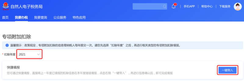 ① 打開個人所得稅APP-首頁-“專項附加扣除填報”-選擇“扣除年度”——“一鍵帶入”;如下圖1、圖2: