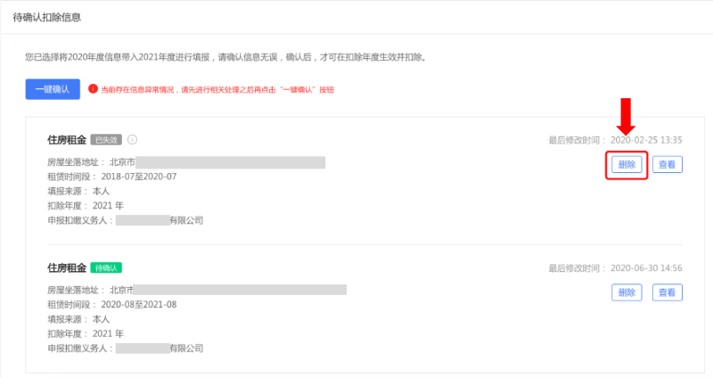 注意:如有“已失效”狀態的信息,則需先刪除之后才能點擊“一鍵確認”。