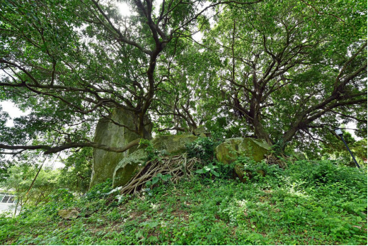 戲仔石——藍(lán)松坤召開(kāi)中共地下黨小組秘密會(huì)議遺址掩在林木中(區(qū)委黨史研究室供圖) 拍攝時(shí)間:2020年5月