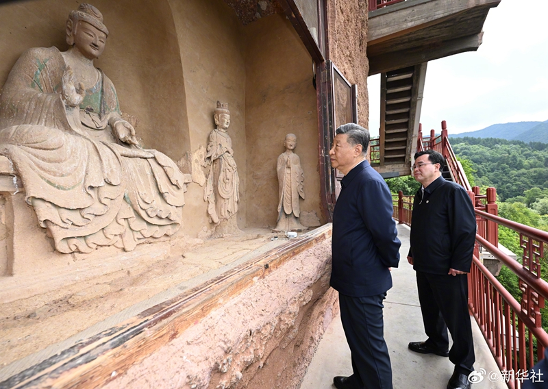 5.   10日下午至11日上午,習近平總書記先后來到陜西省寶雞市和甘肅省天水市考察調研。在寶雞市,習近平考察了寶雞青銅器博物院、渭河生態公園,了解當地加強文物保護利用和開展渭河生態保護治理等情況。在天水市,習近平考察了伏羲廟、麥積區南山花牛蘋果基地、麥積山石窟,了解當地推動文化遺產保護傳承、發展特色現代山地果業等情況。(文字記者:張曉松、朱基釵;攝影記者:鞠鵬、謝環馳、王曄、燕雁、申宏、翟健嵐)